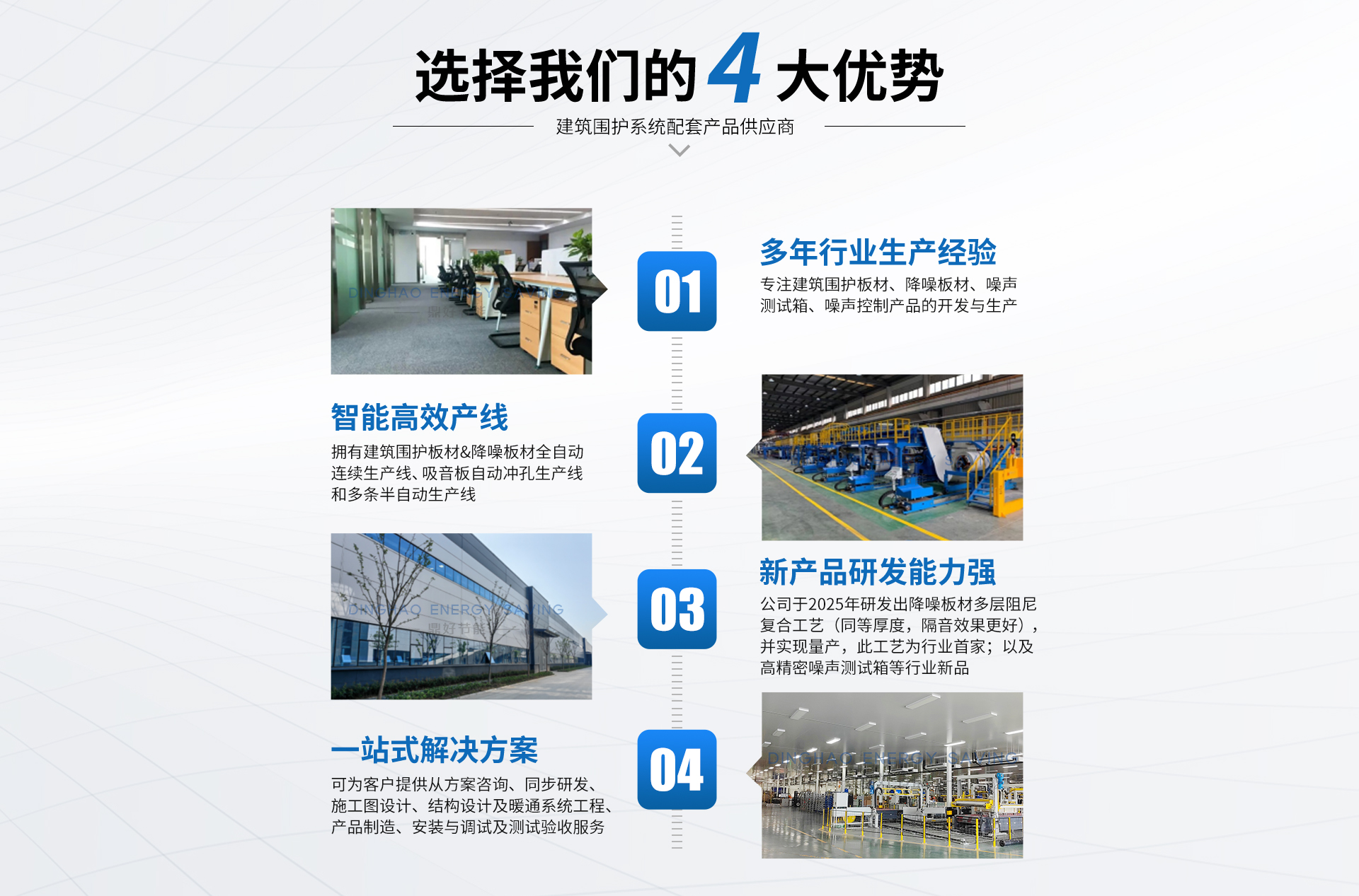 產(chǎn)品具有良好的吸隔聲性、防火性、視覺(jué)美觀(guān)性、易于施工性,產(chǎn)品結(jié)構(gòu)具有高強(qiáng)度、耐久性;主要包括建筑圍護(hù)板材、降噪板材、消聲室、隔音房、噪聲測(cè)試箱、噪聲控制產(chǎn)品的開(kāi)發(fā)與生產(chǎn)。